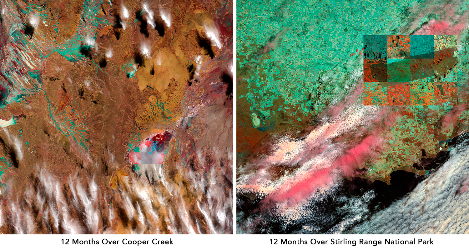These images were produced as time-lapse still images of parts of the Australian continent. They are a kind of hybrid of art and data-visualisation, designed to show the variance in atmospheric and environmental phenomena experienced in a given site, across the space of the a year. These images were produced through my ongoing relationship with Geoscience Australia and the Digital Earth Australia program.